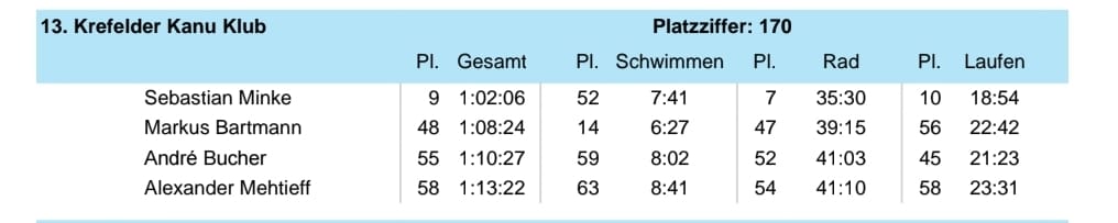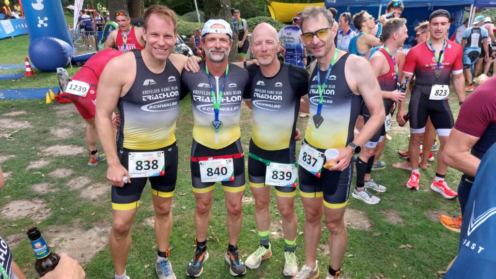 Am Sonntag starteten Markus Bartmann, Andre Bucher, Alexander Mehtieff und Sebastian Minke zum Saisonabschluss der Verbandsliga Süd beim Sprint in Ratingen. Bei herbstlichen Bedingungen war es ein perfekt organisierter Triathlon mit schwimmen im Zickzack im Freibad, einer anspruchsvollen Radstrecke und einer abwechslungsreichen neuen Laufstrecke im Park in der Nähe der Wechselzone. Mit Platz 13 konnte die Mannschaft am Ende des Tages zufrieden sein . Danke Rene für den Support an der Strecke!